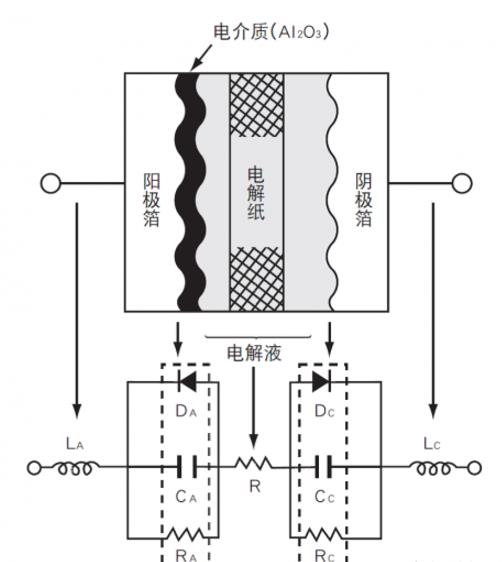 電容的等效電路作為鋁電解電容的電介質(zhì)氧化膜(Al2O3)的介電常數(shù)通常為8~10,這個(gè)值并不比其他類型的電容大,但是,通過(guò)對(duì)鋁箔進(jìn)行蝕刻擴(kuò)大表面積,并使用電化學(xué)的處理得到更薄更耐壓的氧化電介質(zhì)層,使鋁電解電容可以取得比其他電容器更大的單位面積CV值。
